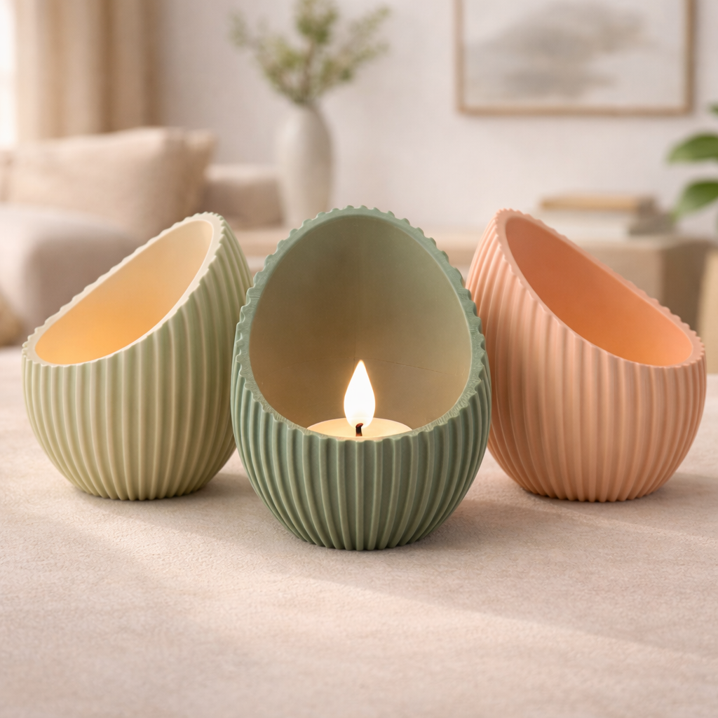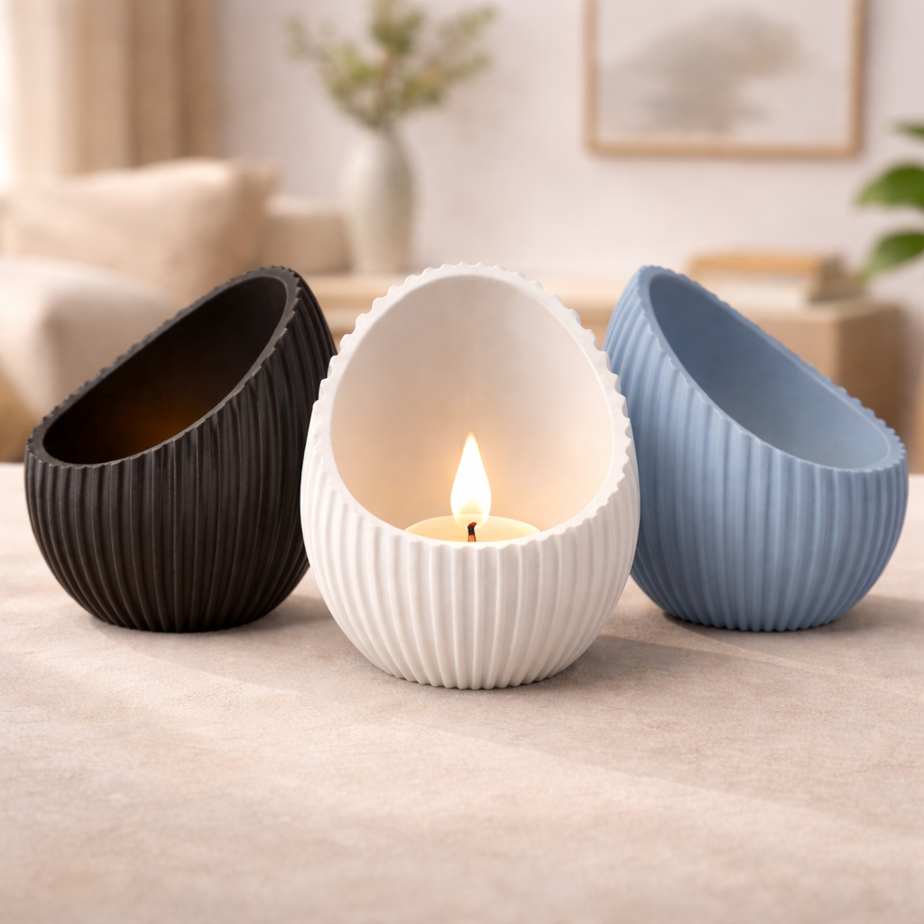 Unsere modernen 3D gedruckten Teelichthalter überzeugen durch ihr elegantes, geripptes Design in Ei Form und sorgen für eine warme, gemütliche Atmosphäre. Perfekt für Wohnzimmer, Schlafzimmer oder als stilvolle Tischdekoration.